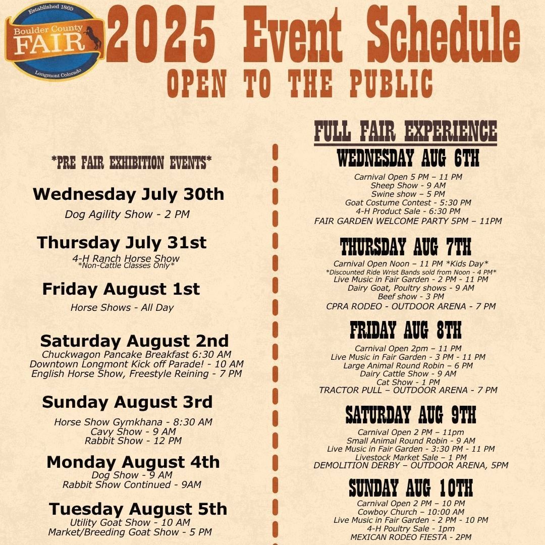 Y’all ready to kick up some dust? The Boulder County Fair is back for its 156th year, and it’s bigger, louder, tastier, and twangier than ever. From August 6–10, the fairgrounds in Longmont transform into a playground of carnival rides, fried food glory, live music, and livestock cuteness overload. Whether you’re in it for the bull-riding thrills, the demolition derby crunch, or just a sky-high spin on the Ferris wheel with a funnel cake in hand — this week’s got you covered.